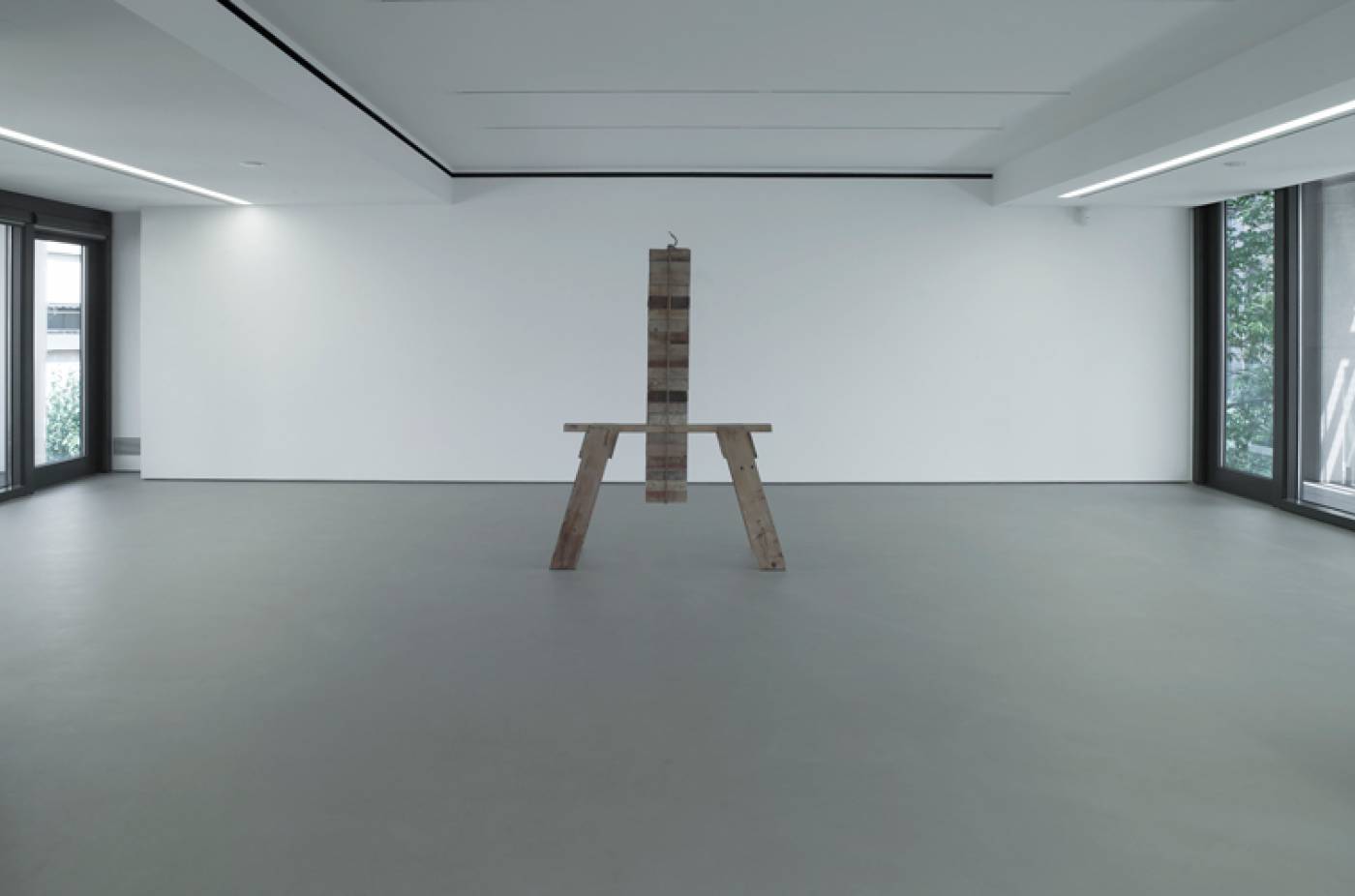 Ray’s latest sculpture opens the show. Produced in solid aluminum, it is a copy of the Roman replica of the Great Eleusinian Relief in the collection of the Metropolitan Museum of Art. The show continues with a materially seductive work that previously existed only in photographic documentation. It combines wood, rope, and brick and sets the stage for a career that could be characterized as transforming experiences into objects. The process of making causes a transformation and creates some new immaterial property.