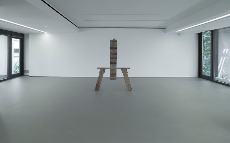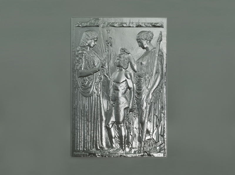 Ray’s latest sculpture opens the show. Produced in solid aluminum, it is a copy of the Roman replica of the Great Eleusinian Relief in the collection of the Metropolitan Museum of Art. The show continues with a materially seductive work that previously existed only in photographic documentation. It combines wood, rope, and brick and sets the stage for a career that could be characterized as transforming experiences into objects. The process of making causes a transformation and creates some new immaterial property.