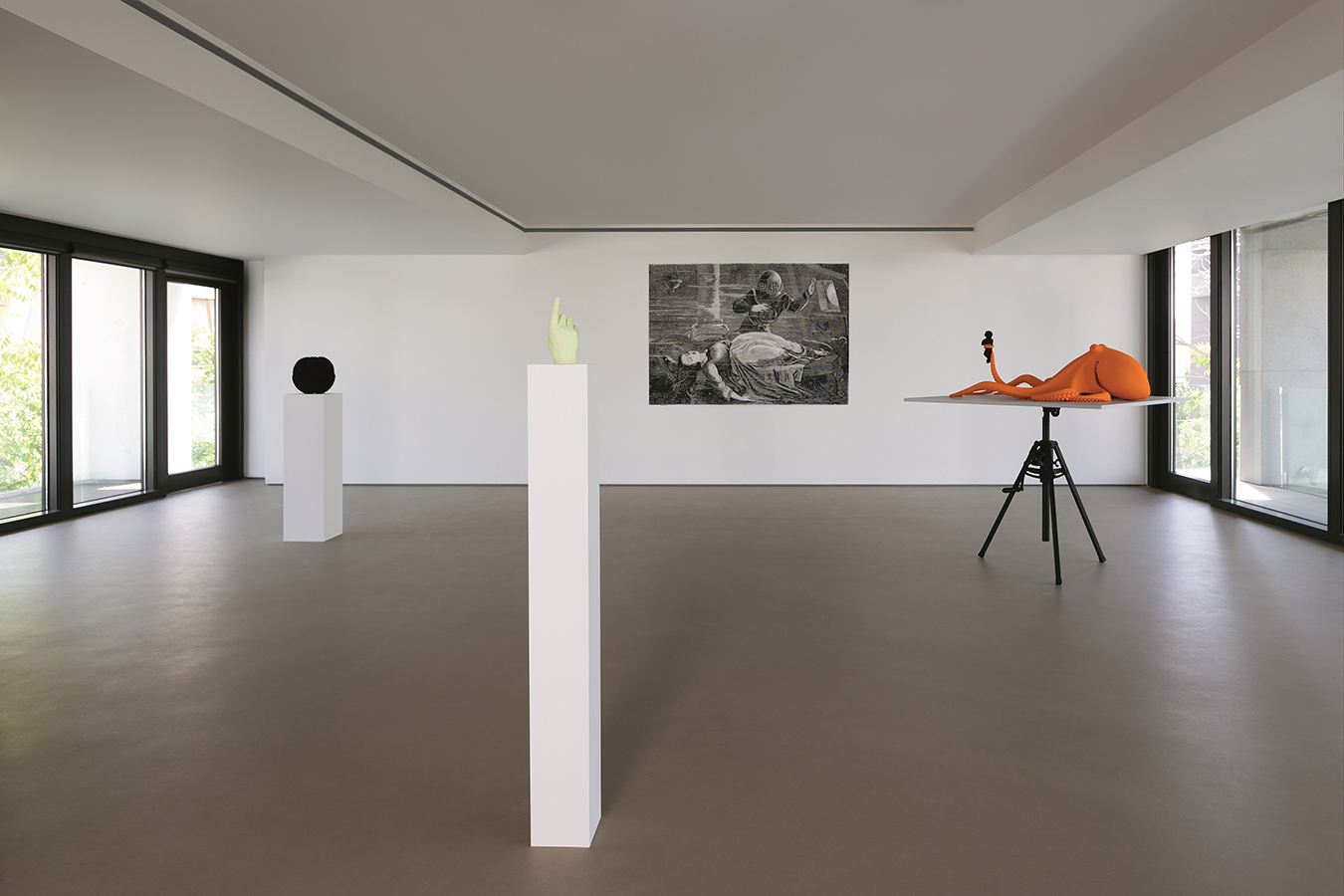Fritsch’s exhibition at the George Economou Collection is the artist’s first solo show in Greece, a country whose own rich history of figurative sculpture, mythology, and storytelling resonates with her work and adds a new layer to its reception. Fritsch has chosen to show recent pieces alongside some of her earliest productions made during and soon after her studies at the Düsseldorf Art Academy in the early 1980s. Across the three floors of the space in Athens, the artist has orchestrated a carefully calibrated visitor experience. The artist has said, “I never see an exhibition as simply a sequence of works but always as one large picture.” Each work included here has been selected for this total environment.