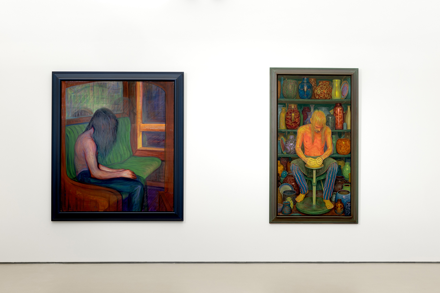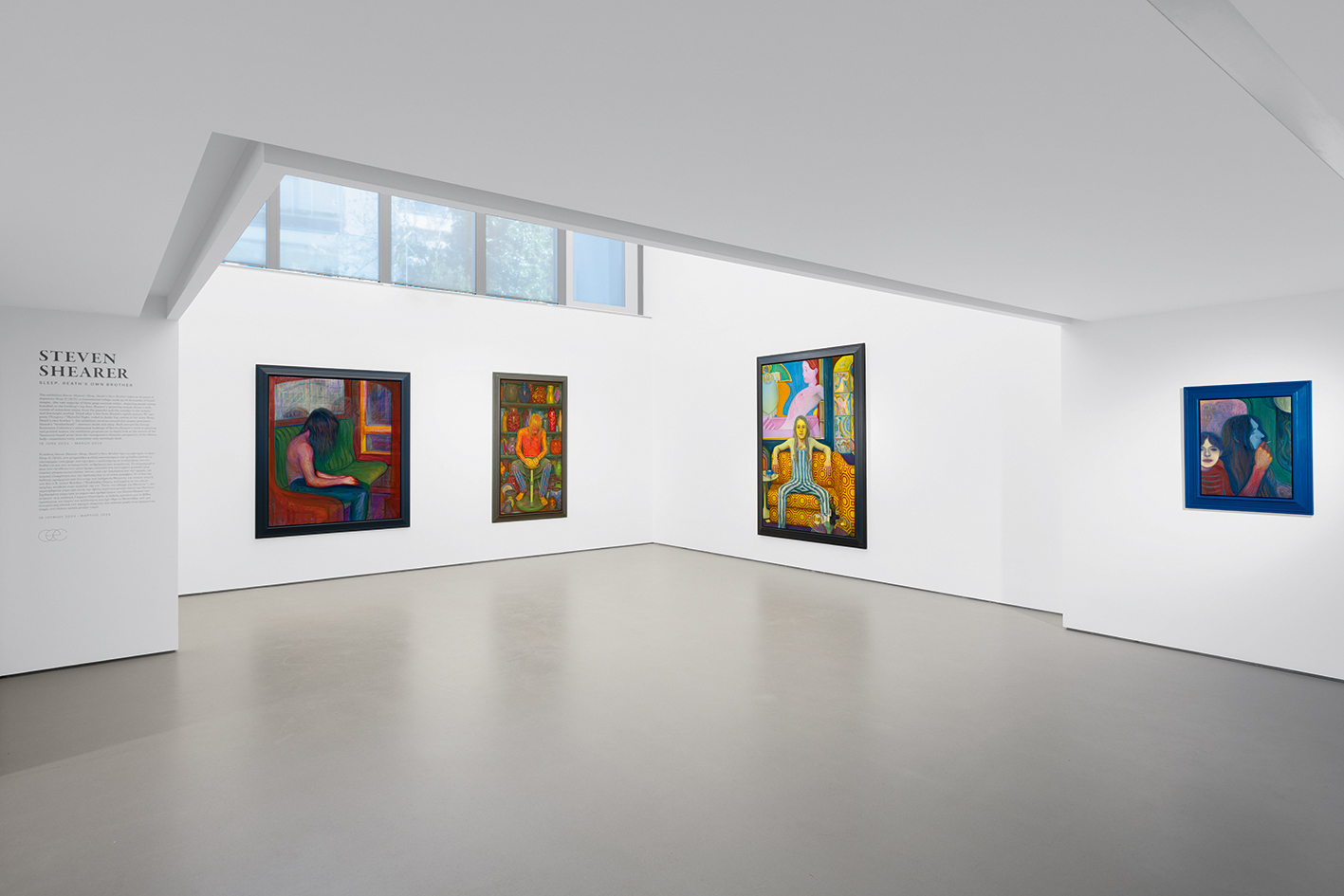 Steven Shearer first gained renown in the early 2000s with a range of works rooted in his deeply personal affinity with seventies teen culture and the proletarian aesthetic of the global metal underground, which the artist continues to mine for iconographic references, however serendipitous, to canonical art history. One of the earliest works in the exhibition, Man Sitting (2006), is exemplary of his transhistorical strategy of image-making: while the source for the painting is a grainy black-and-white photograph of a long-haired shirtless drummer behind his kit, Shearer transforms the image into a hieratic portrait of a brooding youth sitting inside a claustrophobic interior, with delirious echoes of the world of Edvard Munch. (This same Munchian gloom informs the portrait The Sickly Fauve (2014).)