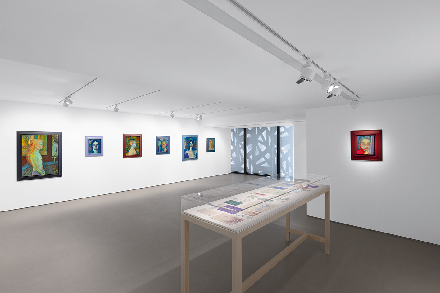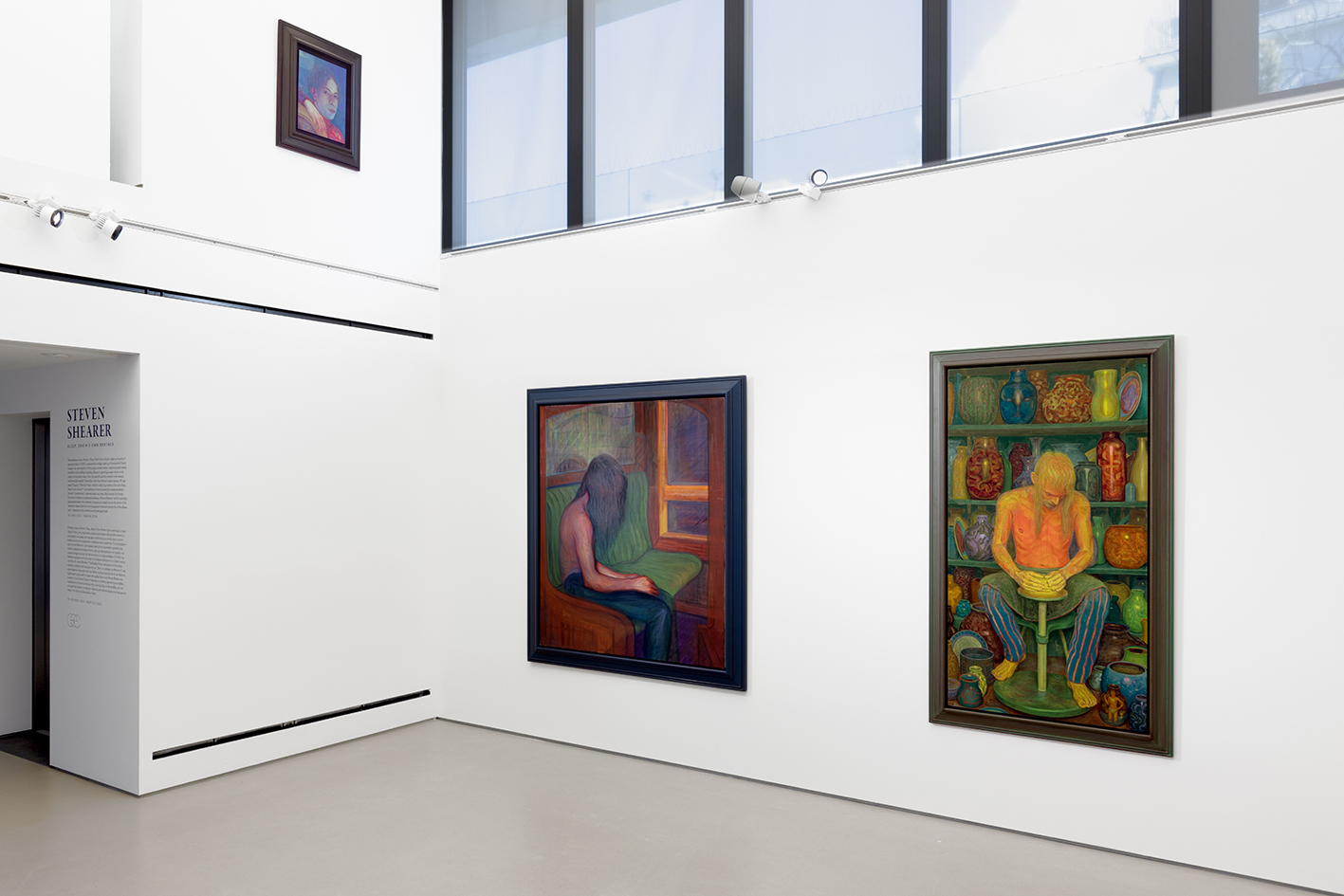At the entrance of the exhibition, a small-scale, red-toned portrait, The Green Collector (2021), who clutches a diminutive blue model, welcomes the viewer to Shearer’s world. Once inside, the “spell of Hypnos” works its magic—along with art’s uncanny powers to bring the inanimate to life.