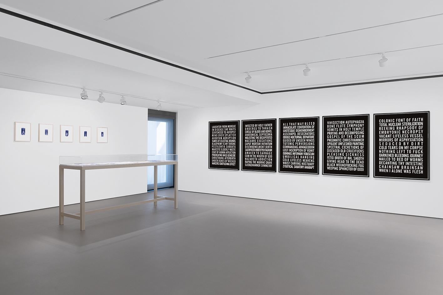 Shearer’s frequent references to the gothic sensibility of late medieval Old Master painting and visual culture reflect the morbid preoccupations of his subject matter; like the ballpoint drawing Band (2004), based on an infamous group portrait of—nomen est omen—death metal pioneers Obituary, hanging from nooses. Band appears in the exhibition beside another macabre masterpiece from the George Economou Collection, Rudolf Schlichter’s watercolor drawing The Artist with Two Hanged Women (1924), while similarly lugubrious works by Schlichter’s contemporary Otto Dix provide further historical backstory. Death, of course, is one of art history’s truly immortal concerns.