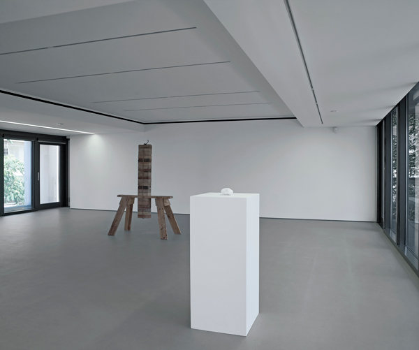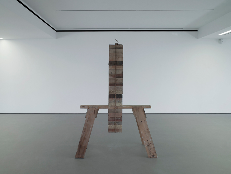 Ray’s latest sculpture opens the show. Produced in solid aluminum, it is a copy of the Roman replica of the Great Eleusinian Relief in the collection of the Metropolitan Museum of Art. The show continues with a materially seductive work that previously existed only in photographic documentation. It combines wood, rope, and brick and sets the stage for a career that could be characterized as transforming experiences into objects. The process of making causes a transformation and creates some new immaterial property.