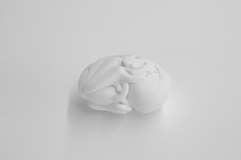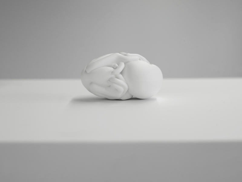 A careful investigation into the biological process of hatching, Handheld Bird, 2006, is a meditation on life and lifelessness. This painted steel sculpture of an embryonic form captures the life, death, and gestation of a creature that has not yet taken its final form. The intricately compressed body, with its folded legs and tucked-in wings, is intensely tactile: the impulse is to take it into your hand, which would make the hand into an egg, while your arm and body become its pedestal or support.