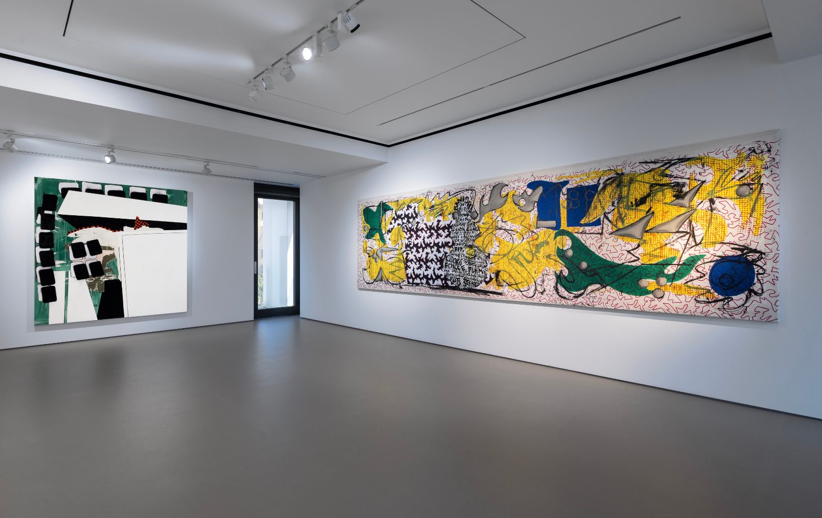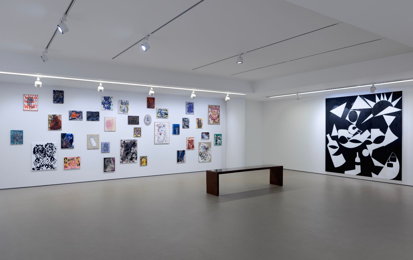 The painting Ninfa (2021) continues the subtle theme of feminine power in her work. Pulchritude is rendered as outlandish, with blue lips and a graceful line suggesting a chin overtaken by a coalescence of black and ochre biomorphic forms resembling birds. The head itself transforms into a dense field of patterns, becoming increasingly abstract. The fifteen diverse, rigorous while and whimsical black-and-white drawings that comprise Drawings Group 2 (2006) elaborate on and connect to the inscriptive elements—sometimes appearing as ideograms or Rorschach-like forms—not unlike Banish Air from Air. They also echo the structure and palette of the Athens Collages earlier in the exhibition. Each work on view is replete with such recursive connections, dissonances, and discontinuities—eye-opening and mind-boggling revelations await.