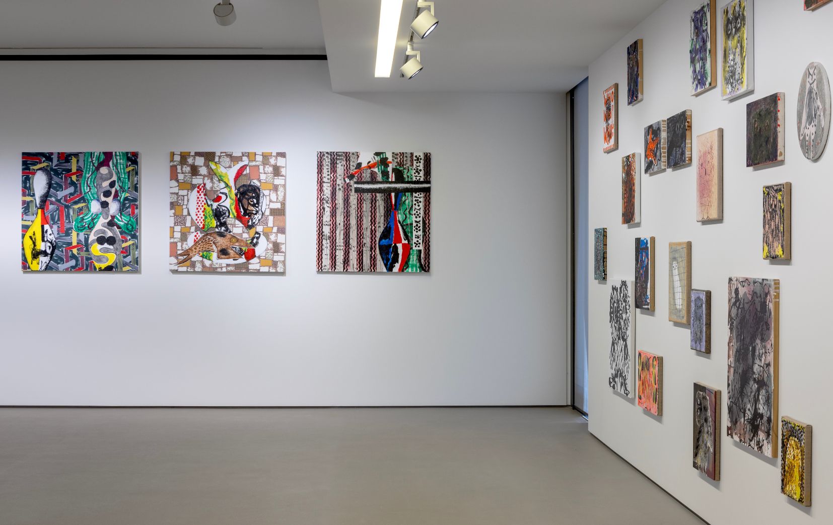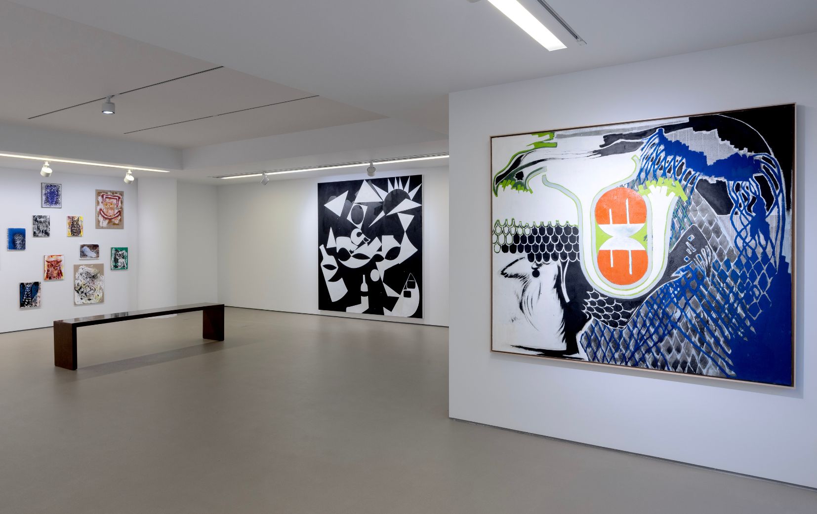While a series of four densely composed paintings on barkcloth are a through line from the first floor, the appearance of two stolid and iconic works on the second floor signal a change of mood in the exhibition. The heraldic devices in Untitled (11/93, I) (1993) carry ominous, even militaristic overtones, in contrast to the insouciant black-and-white cut-out shapes of Time Waiting (2010), which harken back to mid-century travel advertisements’ filtered interpretation of Cubism. These works stand in stark contrast to the owl paintings from 2020–2021, in which the generally solitary birds—symbols of good fortune and wisdom—gather, against type, into a multitude. This capacious theme, with its potential for great and even adorable variation, offered a lighthearted interlude for von Heyl to paint and for the viewer to enjoy encountering the third floor of the exhibition.