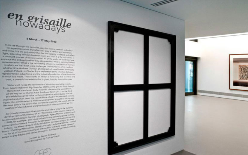 In its use through the centuries, grey has been a medium and colour for experimentation and reflection. Grey is the only colour that has the capacity to absorb and reflect light, extending infinitely between warm and cool, in a constant process of transformation. All of the works on exhibition embrace this ambiguity when they ask questions: What is painting? What is representation? What is the relationship of both to the historical moment in which we live? Each work challenges the boundaries of its medium, whether it be Andreas Gurksy’s photograph of a wellknown painting by Jackson Pollock, or Charles Ray’s exploration at the interface between representation, advertising and the industrial production of the aluminium in which it is made.