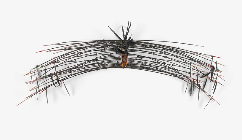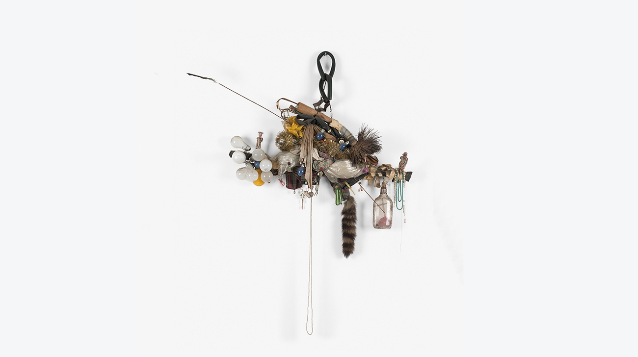 Hammons was part of a generation of artists in Los Angeles responding to the aftermath of the Watts Riots and the Black Power movement. His earliest works, the Body Prints, represent the concerns of Black Americans in the late 1960s: this exhibition includes The Wine Leading the Wine, one of the masterpieces of the series. By the mid-1970s, Hammons would abandon this kind of work, beginning to create an abstract art from the materials of black culture. Beginning with greasy bags and barbeque bones, he soon began to use black hair, bottles, and broken records. He saw the work as deliberately unsaleable and reveals Hammons’s extraordinary way of creating beauty from free-to-use materials, and the wit with which he combined sculptures with punning titles.